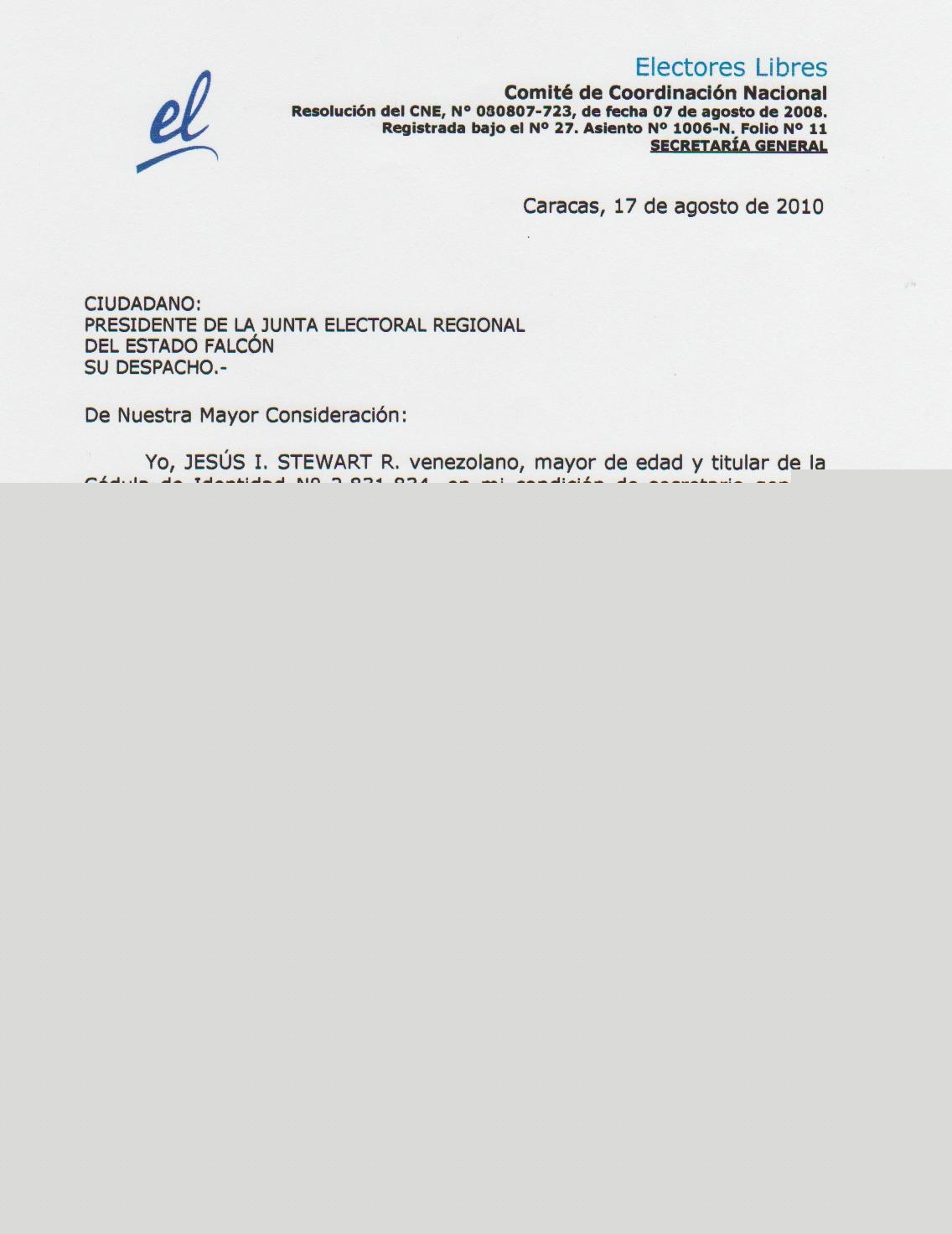 Primeramente en mi condición de cristiano y después de ciudadano de la Republica Bolivariana de Venezuela, igualmente como candidato a diputado en las pasadas elecciones parlamentarias a la Asamblea Nacional, por la circunscripción Nº 2 del Estado Falcón, que comprende los municipios Carirubana y los Taques, y representante de la organización política ELECTORES LIBRES (el); en la condición de COORDINADOR FEDERAL en el Estado Falcón, de esta organización política de rango nacional. A la par como TESTIGO NACIONAL por este partido, debidamente acreditado ante el CONCEJO NACIONAL ELECTORAL (CNE) en las ELECCIONES PARLAMENTARIAS 2010; credenciales anexas en copias con este documento.